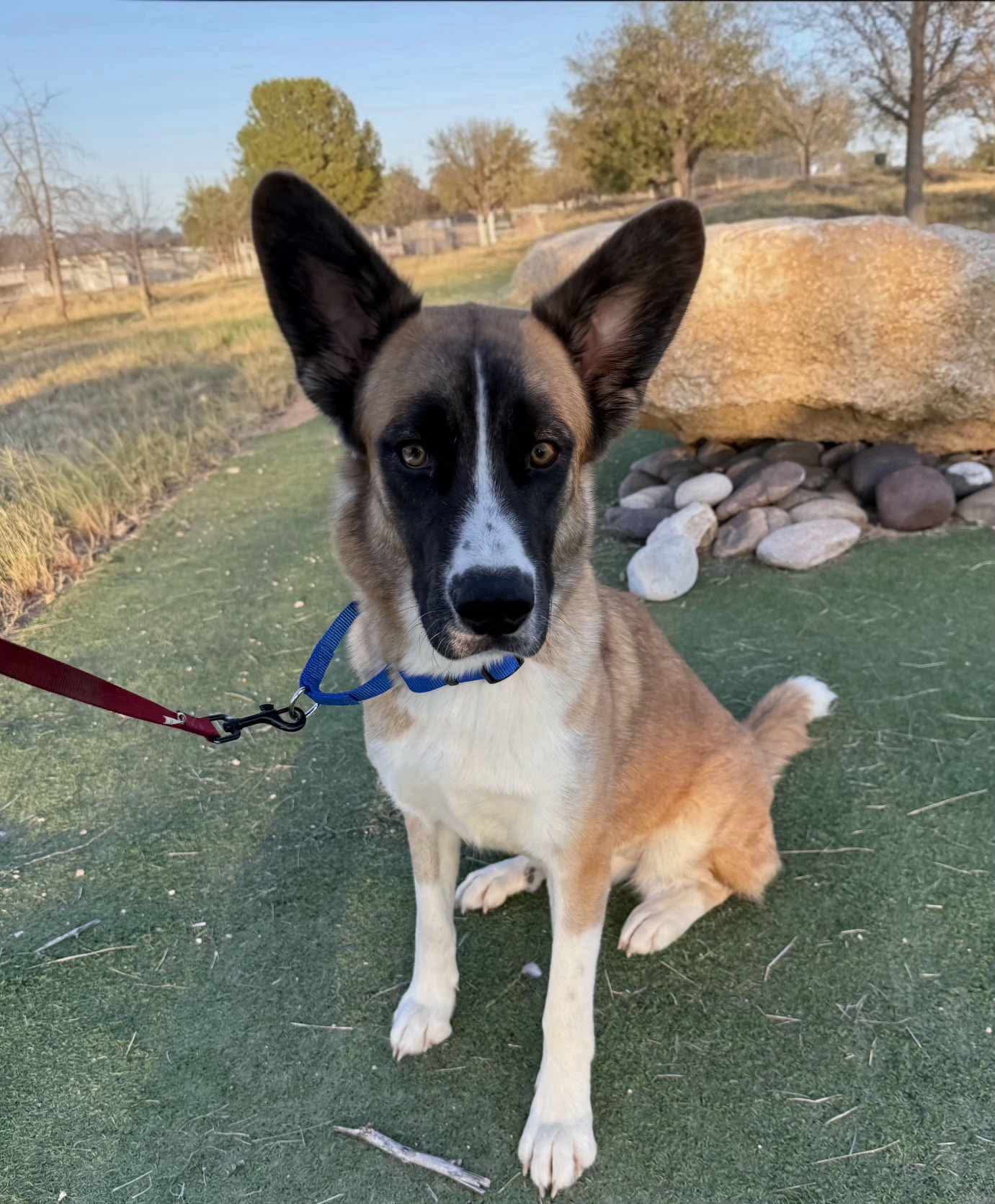 Vera is a lovely girl who is very smart and would do great navigating life with some training and direction. She does not enjoy cats or being crated and has done well in her previous foster home roaming free. Vera is a little shy at the beginning of meeting people and then warms up quickly. She enjoys playing with dogs and plays like a supersized awkward puppy. This girl is so beautiful she may have a future in modeling!
